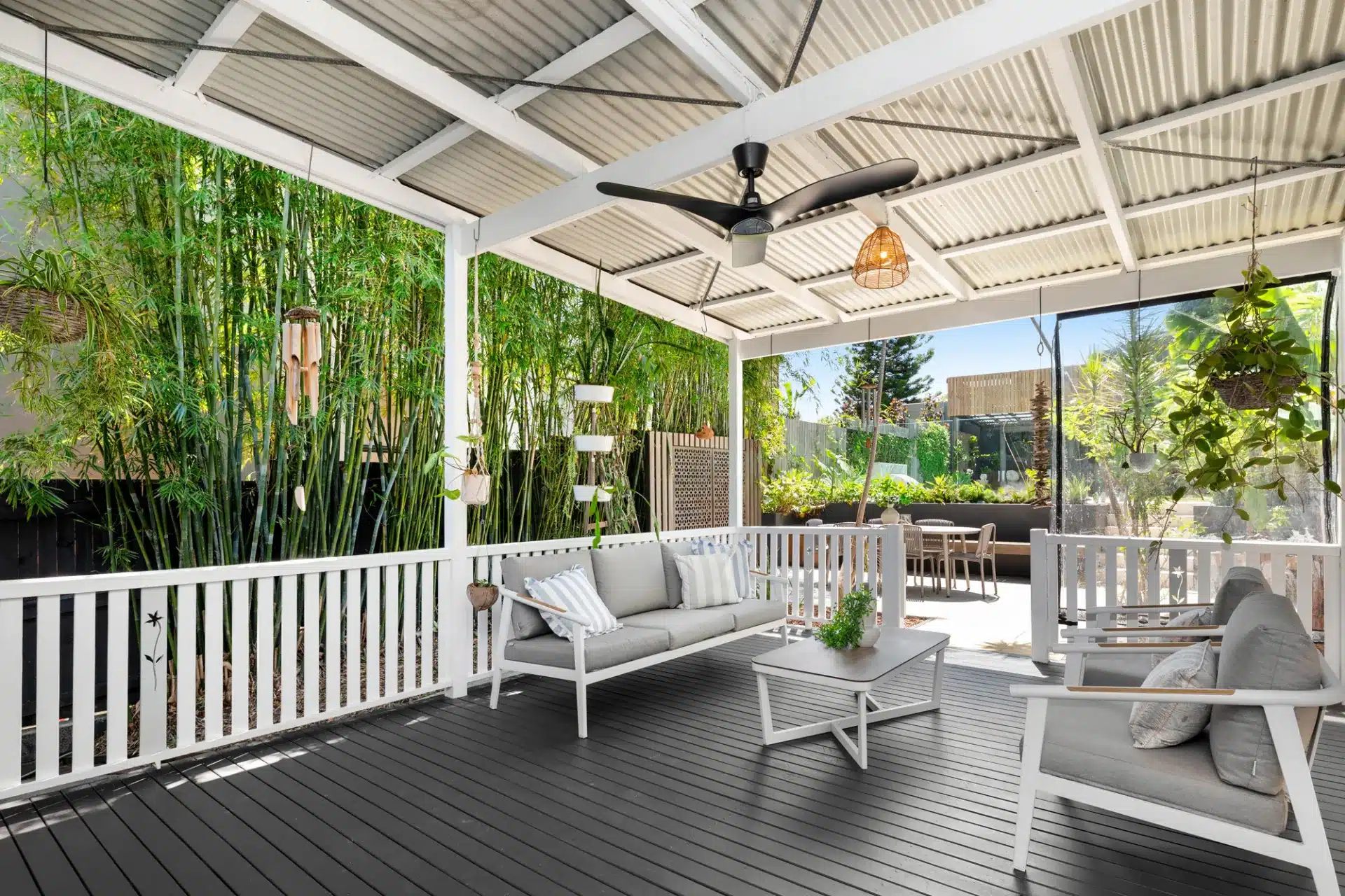 It’s a beautifully honed layout; mature greenery shades the home from the afternoon sun, the master is generously proportioned with French doors to the living room – the dining, kitchen and lounge, extend to beautiful alfresco zones and cool breezes off the river, while three-way bathroom offers a bespoke, spa-like experience, complete with a Japanese soaking tub.